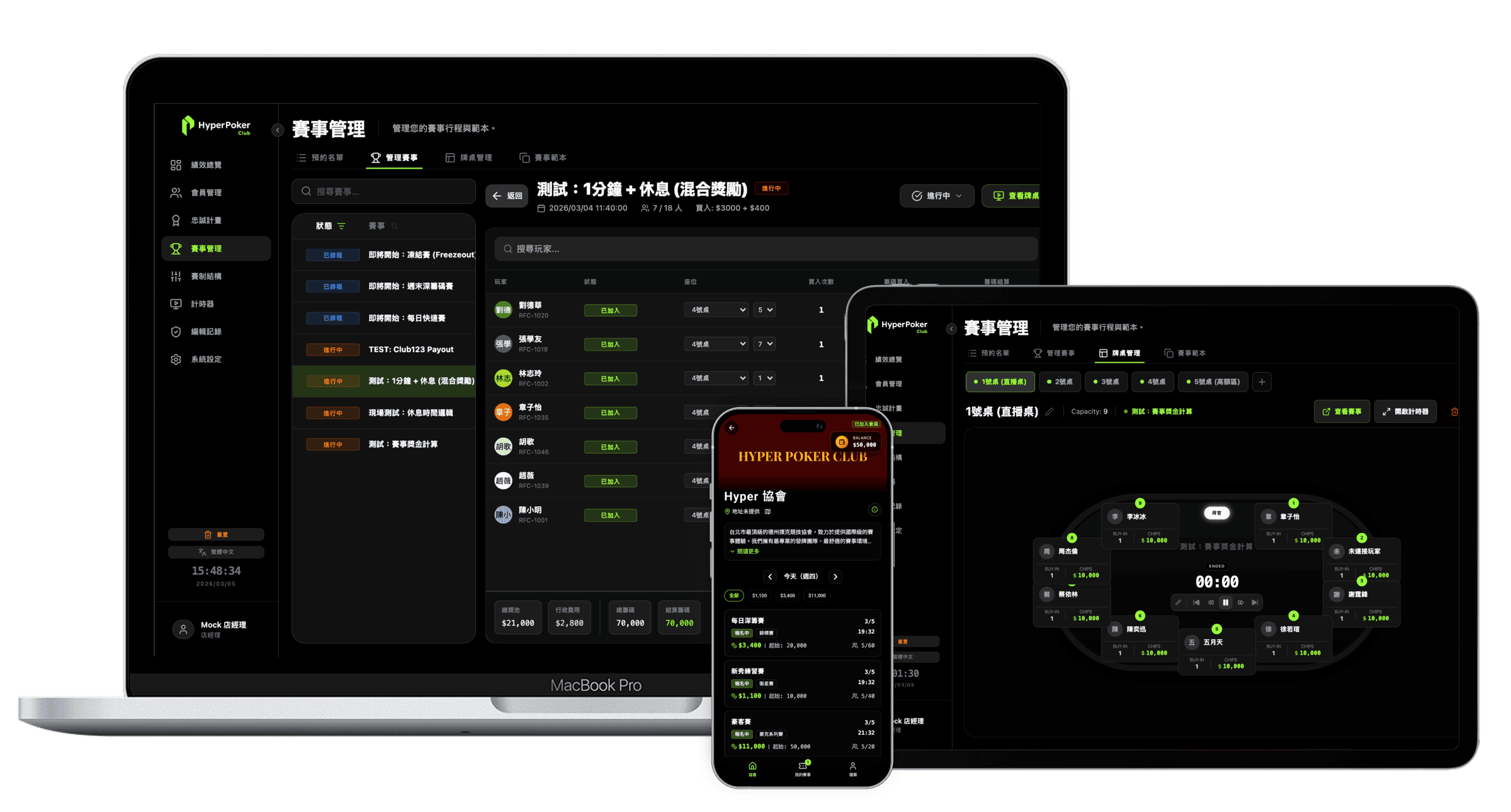HyperPoker Club 是為撲克協會打造的全流程管理系統,從賽事到會員到財務,一套搞定。