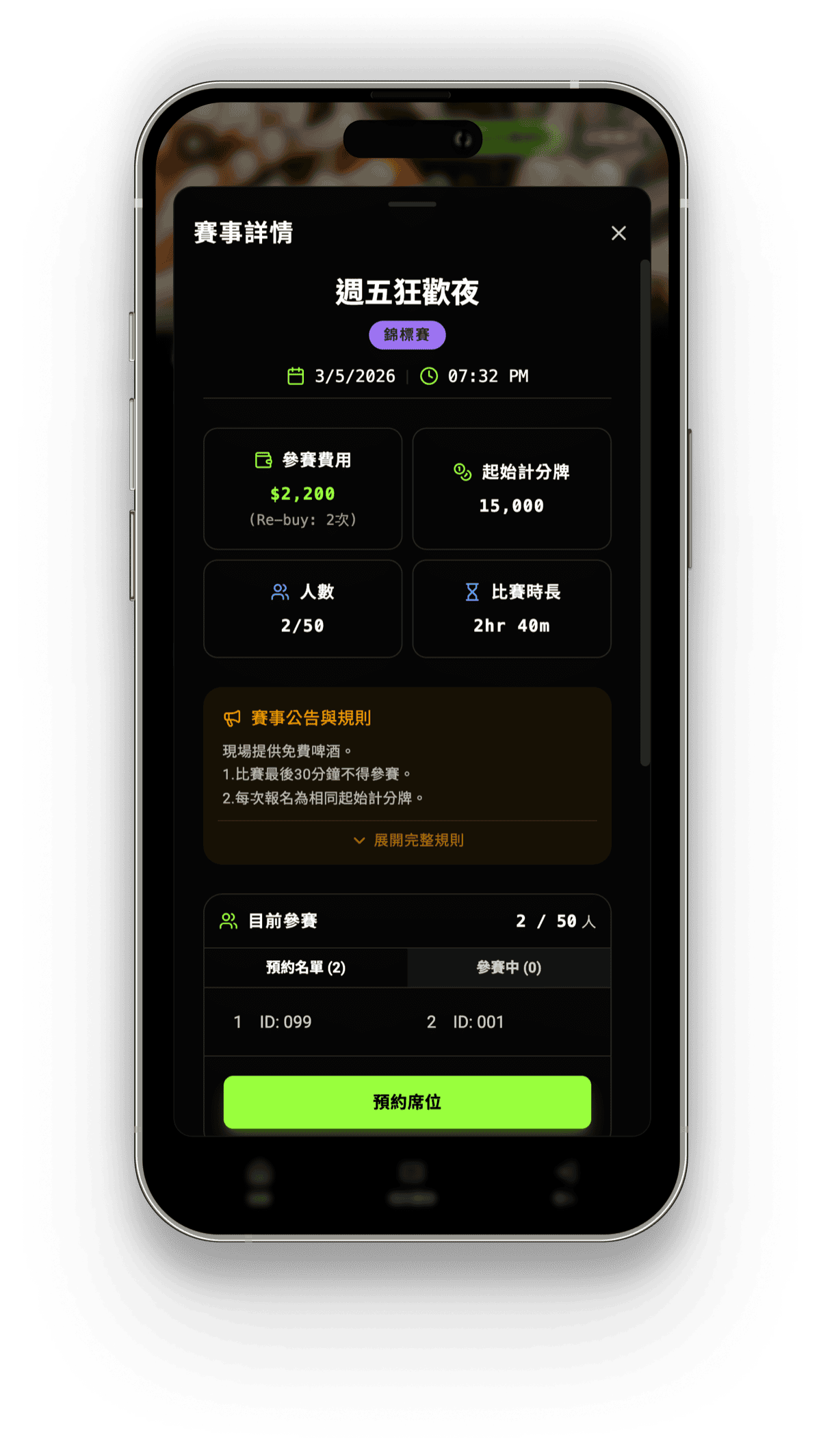 不用再透過 LINE 排隊等回覆。看到賽事、點擊預約、自動鎖定席位,整個過程不到 30 秒。隨時查看報名人數和剩餘席位,賽事額滿前搶先卡位。24 小時都能預約,不用等客服上班。